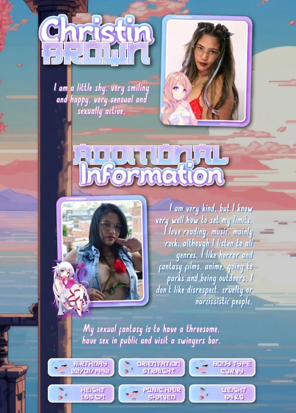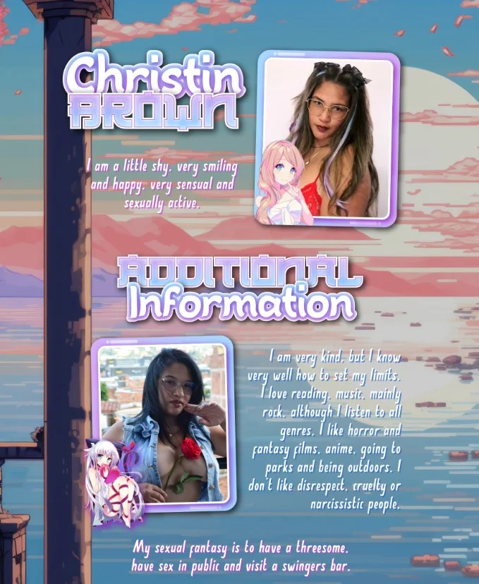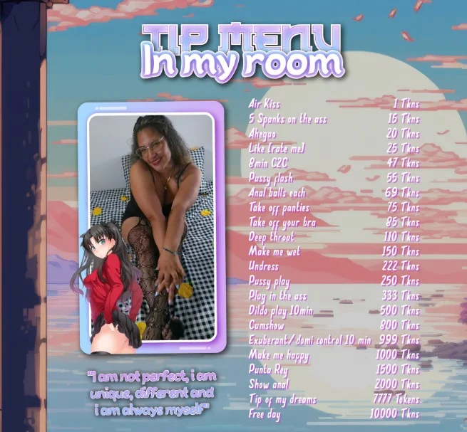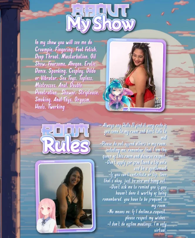 I am a Colombian girl. I love rain. I love music, I don't have a specific genre, I only know that when I hear the rhythm of music, it makes me happy like birds when they see dawn, I like to read, I have a personal library that hopes to be full. I love walking outdoors and discovering new places. Not only have I sex to offer, in me you can find very interesting topics to speak and share. I do not make out of page meetings, I'm just virtual. If you value me for what I am, you are attentive and affectionate, you will always have the best of me. Do not ask me to remind you if you have not done it, it is worth remembering, you must be frequent in my room. Do not request for free (send a advice note and be a gentleman). Do not offend others in my room, including me, remember that I am the queen of this room and I deserve respect.